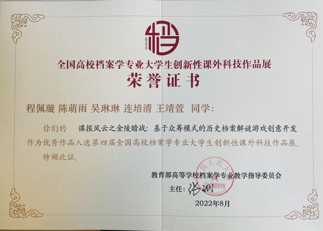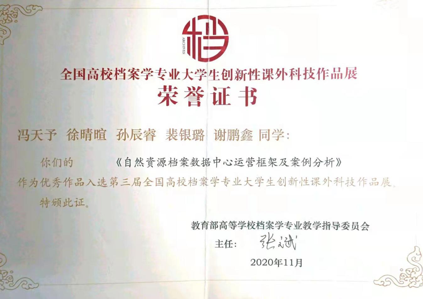 档案学专业学生获全国高校档案学专业大学生
