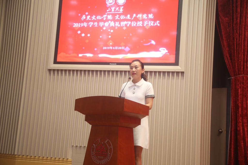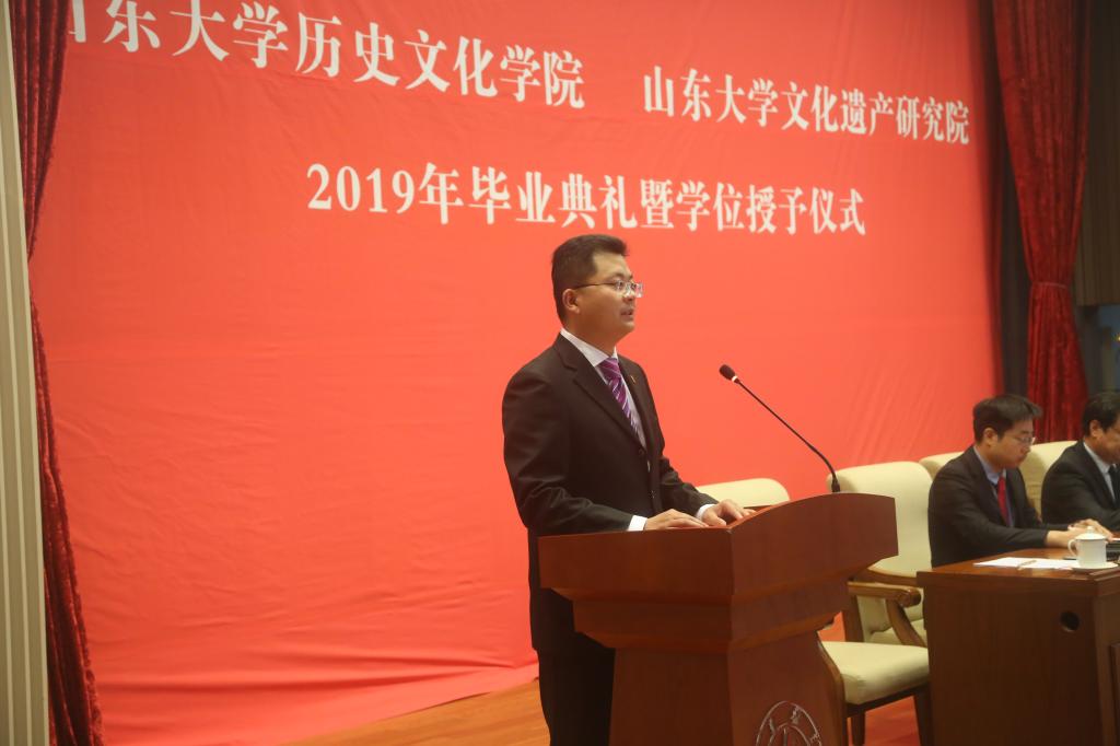 学生家长代表、2016级考古学专业硕士研究生王思佳同学的家长周泓女士祝贺同学们学有所成,感谢学校、学院和教师们的育人工作,祝愿同学们不忘求学山大的初心,用一生的努力书写无愧于新时代、无愧于山大人的华彩篇章。