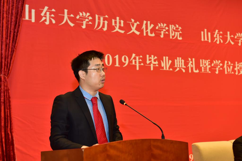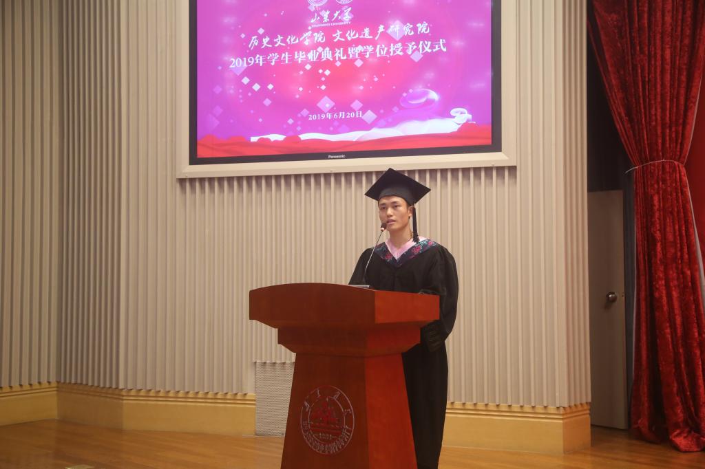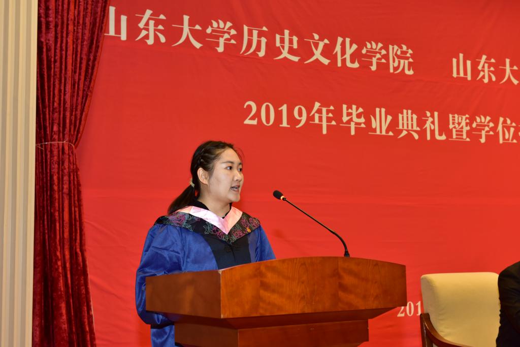毕业生代表、2015级历史学专业本科生赵显锋同学和2016级文化产业管理专业硕士研究生周恋榕同学分别发言。他们回顾了大学的美好时光,感恩师长们的悉心培养,对学院优良的育人传统致以敬意。临别之际,他们对校园里一草一木深怀眷恋,祝愿学院“人才济济,再书华章”,祝愿恩师们“身体健康,桃李芬芳”,祝愿师弟师妹“珍惜年华,茁壮成长”;同时决心胸怀高远的人生格局,带着山大历史人的天下情怀,勉励彼此在奋斗报国路上“梦想常青,担当常在”。