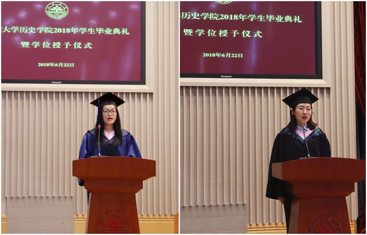 研究生毕业生代表、2015级档案学专业楚艳娜回忆了在历史文化学院的成长,从自卑到自信,从平凡到优秀,她用“感恩”二字总结了七年时光,“感恩学院,包容我们的成长”,“感恩学院,给予我们丰富的人生体验”。本科生毕业生代表、2014级文化产业管理专业王梦晓用真切的语言阐述了历史文化学院在其成长路上无可取代的重要作用,深厚的文化底蕴,优质的教学资源,严谨的治学精神,学贯中西、诲人不倦的老师,一起奋斗的同窗,精彩的校园生活……都是她大学生涯中宝贵的财富和不舍的温暖。两位毕业生代表在发言中都表示将用回忆的力量点燃年轻的希望,用当代青年的担当开启人生新的征程,志存高远,奋发有为,不辜负母校和学院的期望与培养。