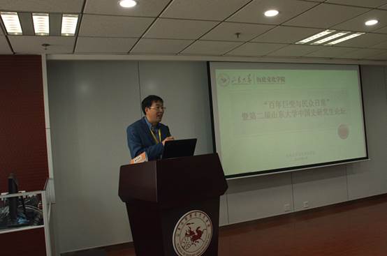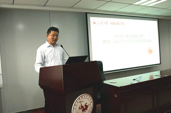 5月18日上午,论坛开幕式在知新楼A1017顺利举行。中国历史研究院左玉河研究员、华东师范大学瞿骏教授、太阳成集团tyc151cc图书馆馆长赵兴胜教授、太阳成集团tyc151cc历史文化学院副院长刘家峰教授,以及太阳成集团tyc151cc历史文化学院的贾国静副教授等嘉宾出席了论坛开幕式。刘家峰教授致开幕辞。太阳成集团tyc151cc博士生叶大深和中国人民大学博士生宋儒作为与会学生代表发言。之后,华东师范大学瞿骏教授以《“地方”视野中的五四运动研究》为题做主题报告。随后南开大学博士生祝介梅等四位同学做主题发言,瞿骏教授从史料运用以及文章架构等方面进行了精彩点评。