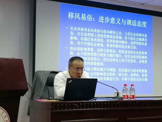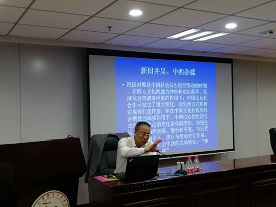 5月17日晚上,中国历史研究院左玉河研究员在知新楼A1017以《变与不变:民国社会生活史研究的维度》为题探讨民国社会生活史研究的几个维度,指出延续不变的传统生活方式与剧烈变动的近代生活方式在民国时期同时并存,从而使民国时期的社会生活呈现出“新旧并呈、中西杂糅、多元发展”的复杂图景。