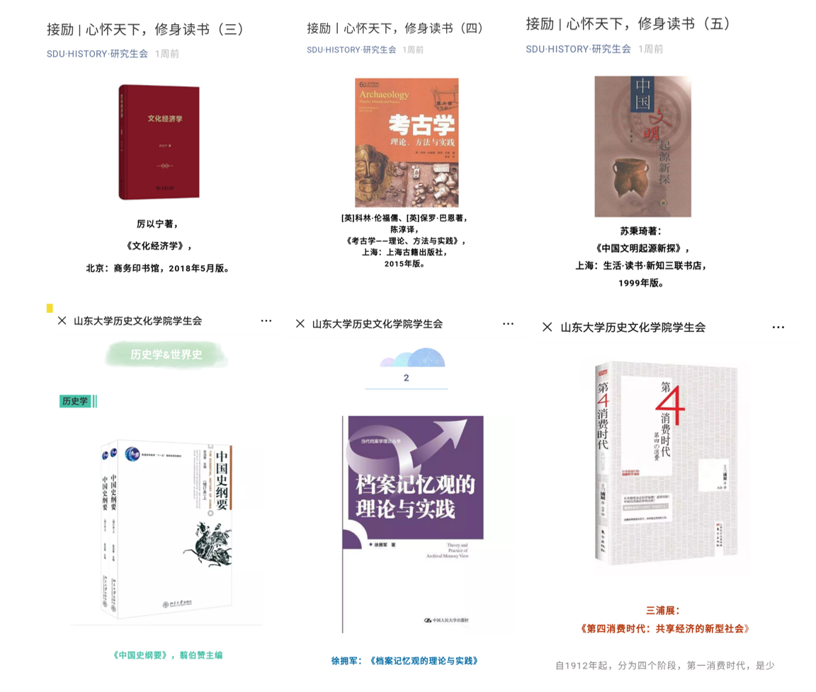 我院各级团学组织积极贯彻落实“停学不停课,学习不延期”,结合专业特色,由学生会、研究生会微信公众平台分别推出“好学”和“接励”专业学习栏目,一方面针对同学们居家学习实际,整理推送了各专业适用的优质信息网站、数据库资源等,方便广大同学进行专业学习和学术研究;另一方面邀请班主任老师、各学系专家教授推荐专业阅读书目,整理出适合不同年级学生假期阅读学习的推荐书单,并分享经典课程的慕课资源。以此积极引导学生充实精神生活,树立正确的价值取向和学术导向,通过广泛学习阅读,进一步拓展专业学习的深度和广度。