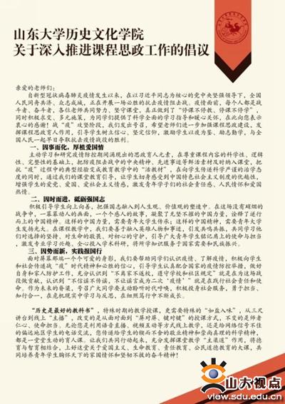 上半年,结合抗击疫情形势,学院面向全体教师发布了《关于深入推进课程思政工作的倡议》,要求广大教师因事而化、因时而进、因势而新,主动学习和研究疫情防控期间涌现出的思政育人元素,把防疫阻击战中的中央精神、先进事迹等鲜活素材变成教育教学中的“活教材”,融合历史学科资源、学术资源转化为育人资源,促进专业课程建设与思想政治教育工作的同频共振,涵育学生爱国情、强国志、报国行。