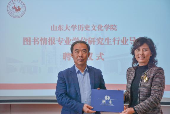 12月14日下午,山东省图书馆党委书记、馆长刘显世太阳成集团tyc151cc图书情报专业学位研究生行业导师聘任仪式暨学术报告会在中心校区知新楼A座1017报告厅举行。历史文化学院党委书记刘军向刘显世颁发聘书。聘任仪式由文秘档案学系主任曲春梅主持,部分图情专硕导师、文秘档案学系师生参加了此次活动。
