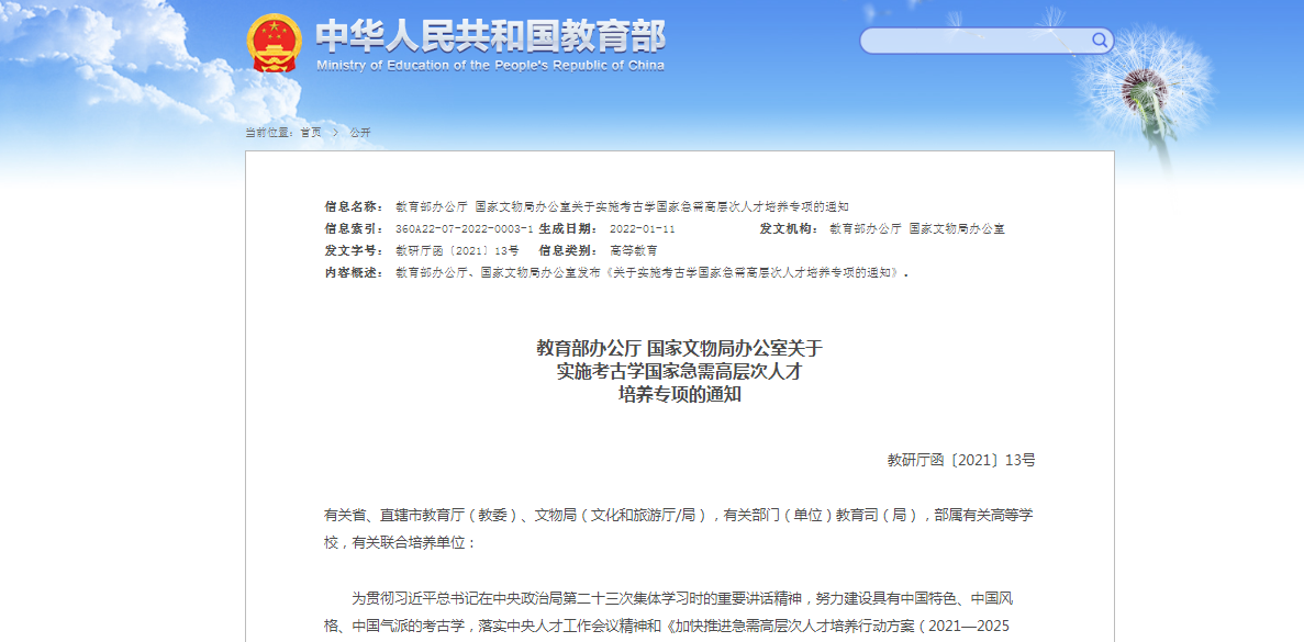 《通知》指出,考古学经过长足发展,目前已初步建立起具有中国特色的学科体系、学术体系和话语体系,在揭示中华文化、阐释中华文明、解读中华文化与世界文化交流等方面发挥着不可替代的重要作用,但是仍然面临着考古学高层次人才规模小、创新力不足等问题,要求加快培养一批支撑考古核心技术突破和行业发展的急需高层次人才。