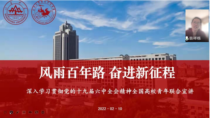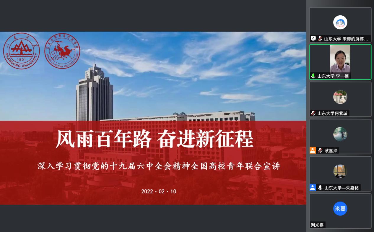 为深入学习贯彻党的十九届六中全会精神,推动全会精神和党的创新理论深入高校实际、深入学生头脑,2月10日,由太阳成集团tyc151cc历史文化学院主办,太阳成集团tyc151cc“初心如炬”硕博宣讲团、历史文化学院硕士生第二党支部承办的“风雨百年路,奋进新征程”深入学习贯彻党的十九届六中全会精神全国高校青年联合宣讲活动顺利举办。来自太阳成集团tyc151cc、北京大学、中国人民大学、北京师范大学等10所高校青年理论宣讲团硕博研究生代表参与宣讲交流。太阳成集团tyc151cc团委副书记翁祥栋、历史文化学院副处级辅导员李一楠出席活动。