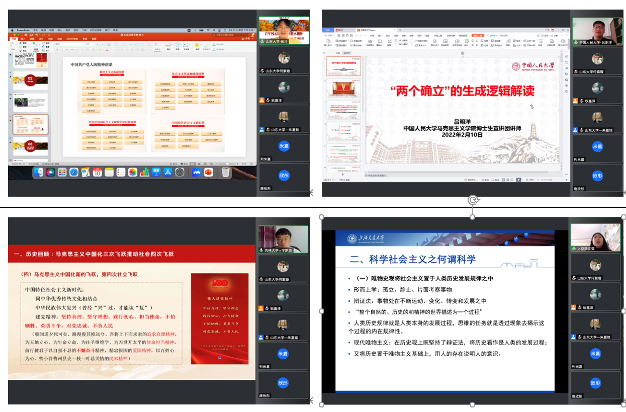 本次联合宣讲活动,共有来自全国24所大学的200余名师生共同收听宣讲,涵盖马克思主义理论、历史学、法学、工学、管理学等多个学科领域,以大历史观把握大局大势,从细致入微的实例数据、思维导图、专业科研把握现实实际,充分发挥硕博研究生学术所长,提高青年学生政治站位和理论素养,达到了参与面广泛、内容全面深刻的宣讲效果,以期进一步营造学科融合、理论与实践结合的大学习局面,推动十九届六中全会精神把握准、理解透、落实好,走向深入,走向实际,教育引导广大师生以高昂的精神风貌建功新时代,奋进新征程。