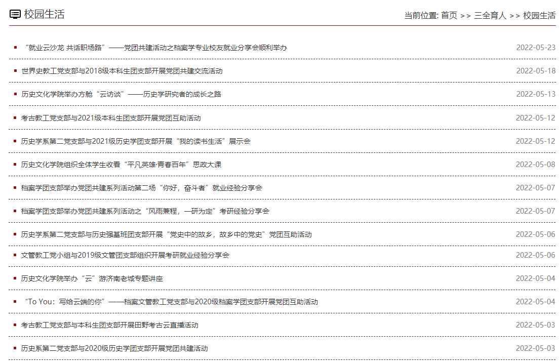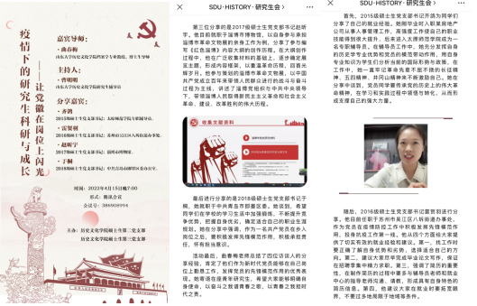 强化党团共建,带活“新力量”。学院5个教工党支部分组与13个学生团支部实现对接,建立对接通讯录,召开支部书记会议,明确共建要求,研讨共建方案,各党支部迅速组织实施,了解对接团支部学生需要和诉求,共提交6个共建方案、28个活动计划。先后开展了“相遇山大,再启征程”文创大赛、“启智润心”与青年学者在一起、考古工地“云”参观、“济南旧城建筑的历史”专题讲座、方舱“云访谈”、考古挖掘项目介绍、“我的读书生活”展示会、“党史中的故乡,故乡中的党史”、“写给云端的你”等活动,充分发挥了师生互助、教学相长优势,为师生深入对话和交流提供了平台,凝聚党团组织合力,进一步帮助学生在校园封闭管理期间更好地学习和生活。