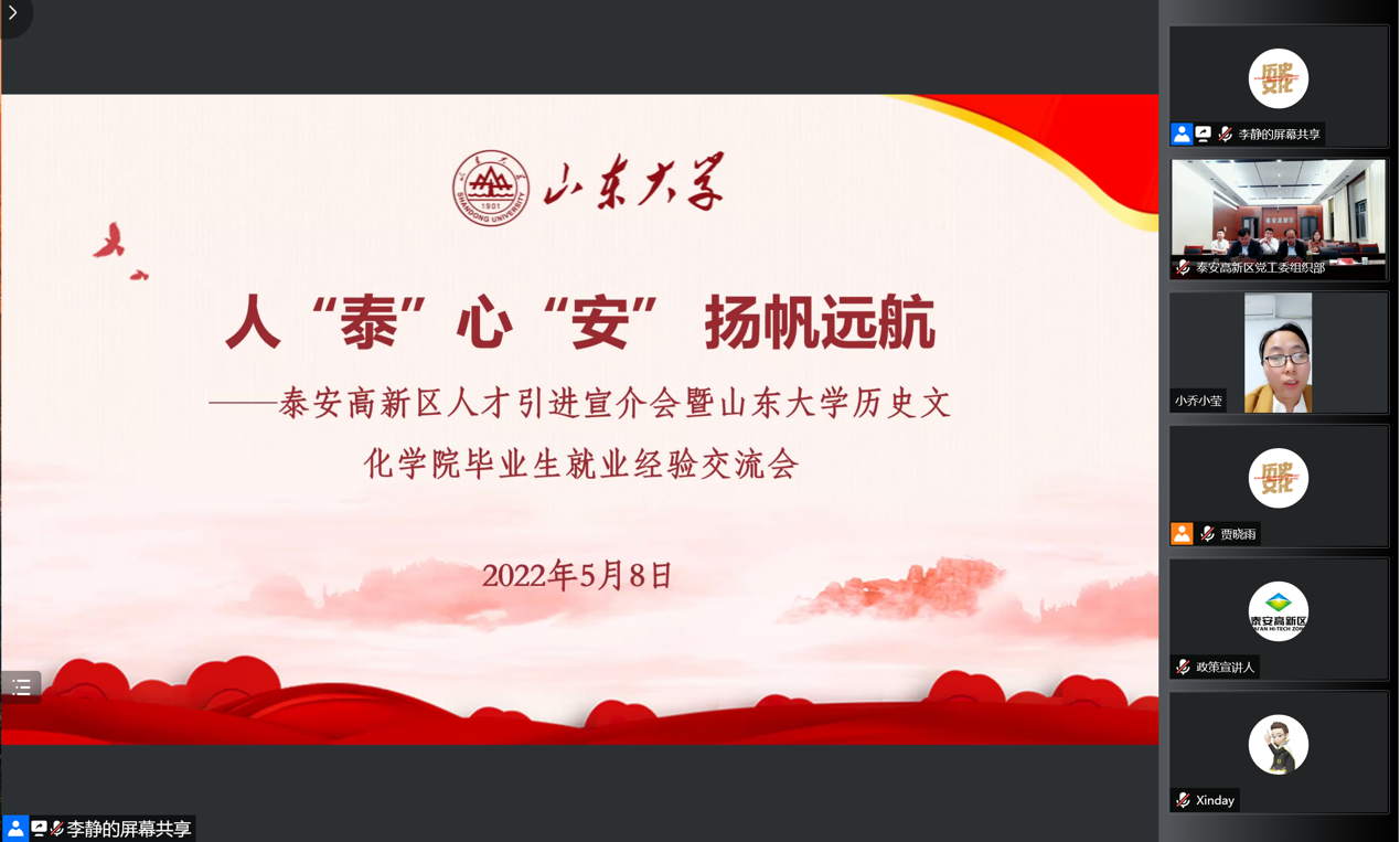 助力升学就业,做好“引路人”。为充分了解毕业生就业情况和职业规划,尽力解决毕业生职业规划、就业招聘、毕业升学等方面的现实问题,学院举办“疫情下的研究生科研与成长——让党徽在岗位上闪光”导学思政云下午茶活动,邀请四位已毕业优秀研究生分享工作经验及心得体会。学院同泰安高新区人才工作领导小组办公室联合举办“人‘泰’心‘安’,扬帆远航”——泰安高新区人才引进宣介会暨毕业生就业经验交流会,努力实现校地协同合作,助力青年学子成长成才。此外,在师生互助计划中,学院组织开展了“你好,奋斗者”就业经验分享会、“风雨兼程,一研为定”考研经验分享会、“就业云沙龙 共话职场路”校友就业分享会、未来发展分享会等,帮助学生明晰学术科研方向,确定职业发展目标,为未来升学就业打下坚实基础。