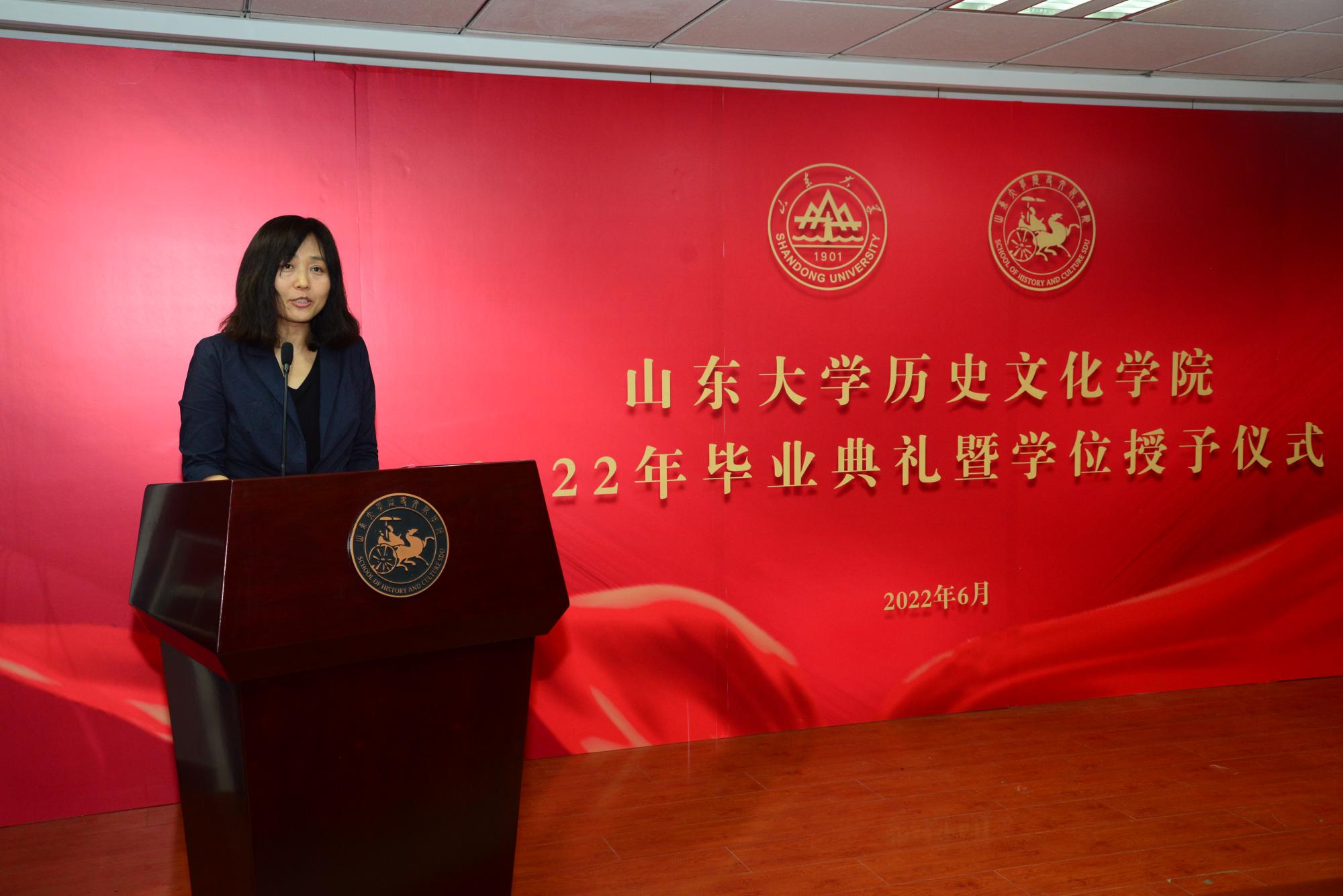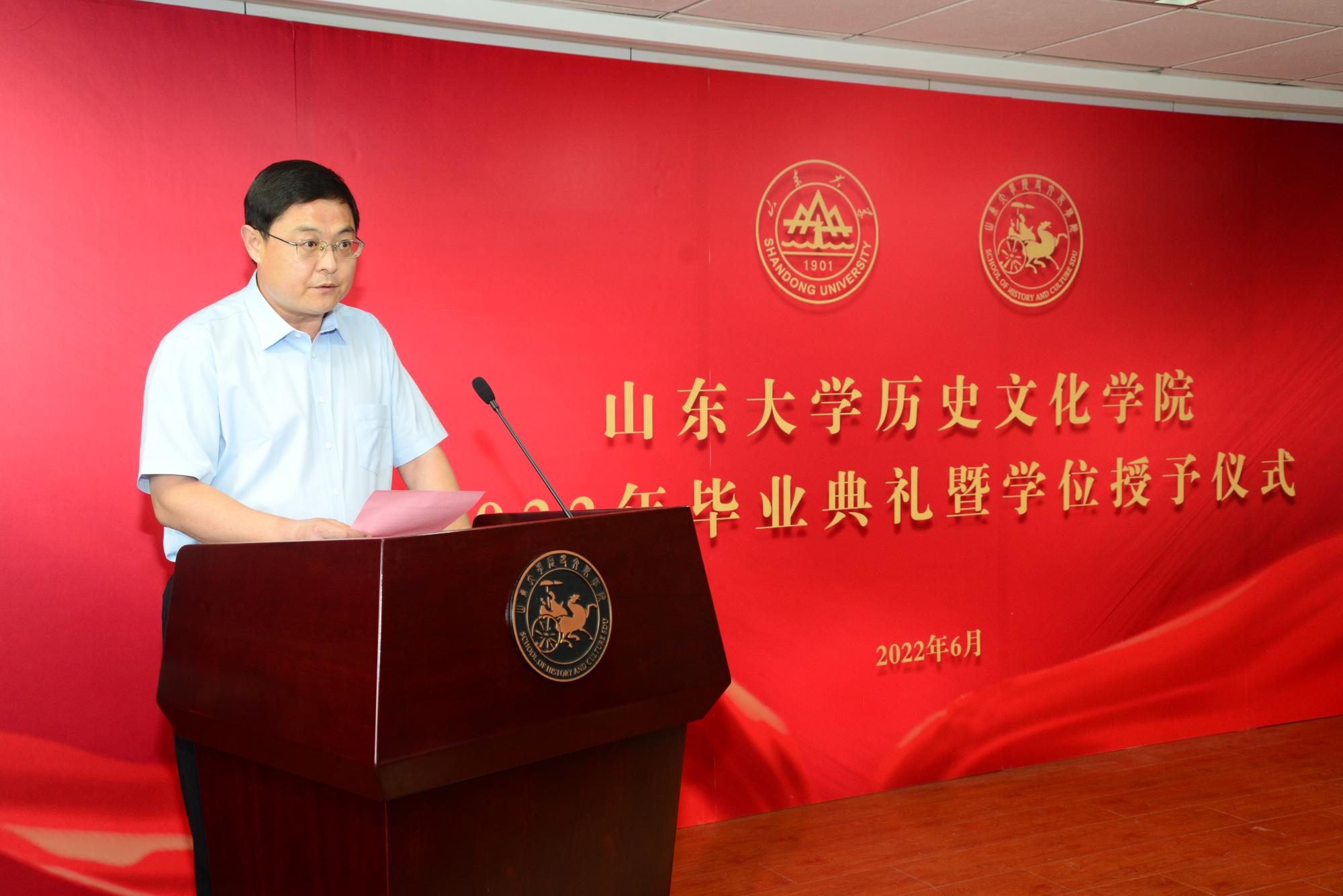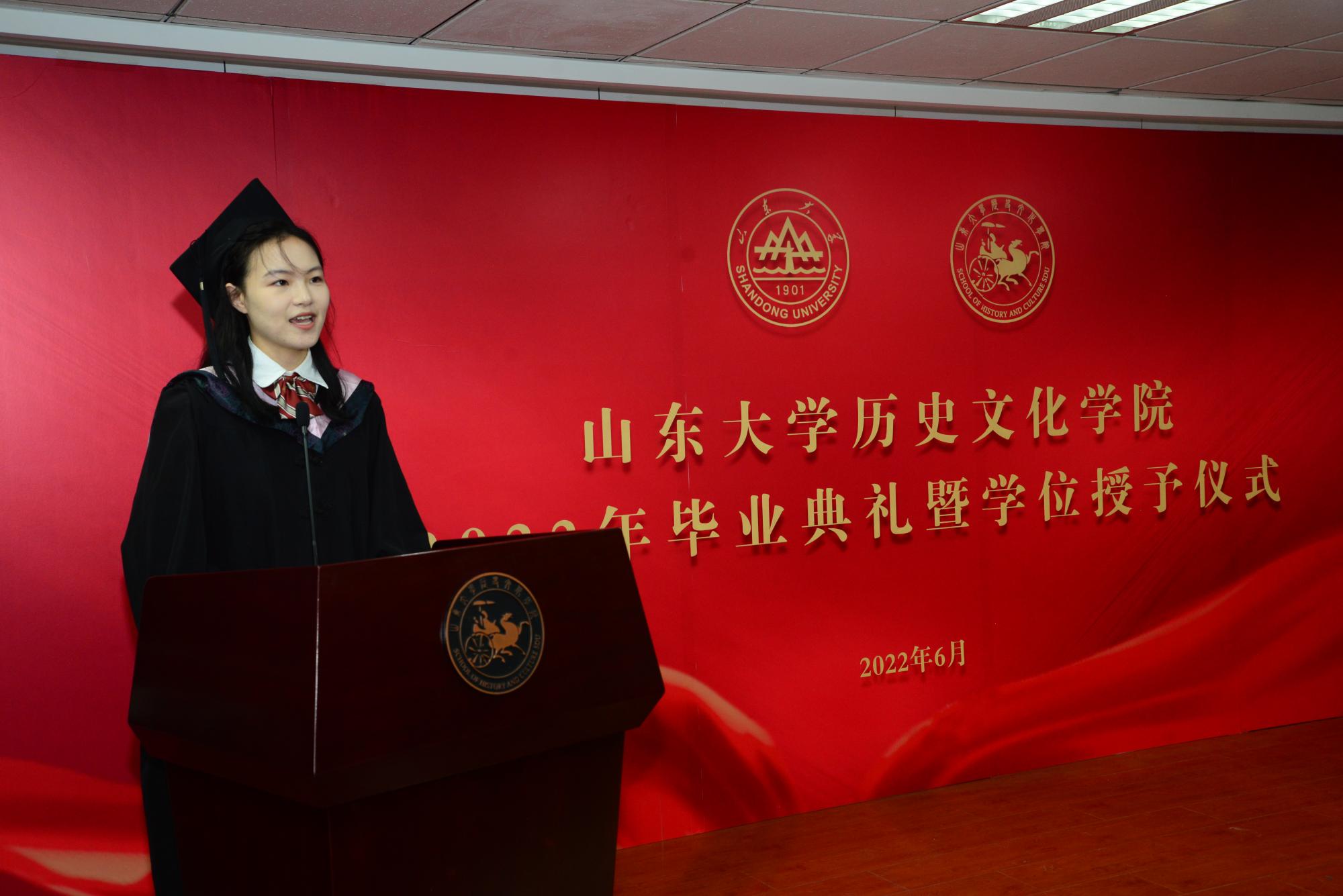 毕业生代表2018级考古学专业博士研究生赵星宇表达了对老师、朋友和自己的感谢,抒发了面对未知未来的挑战的勇气,对老师和同学表达了诚挚感谢和美好祝福。2018级文化产业管理专业本科生丁佳宁回顾了珍贵的求学时光,体悟了教师对学生的滋养与影响,表达了对学校、学院、师长的真挚谢意。两位毕业生代表在发言中都表示要以山大之魂,明爱国之心、励强国之志,自觉担当起时代赋予的历史使命,在时代的舞台上创造出新的历史伟业,不辜负母校的培养与期望。