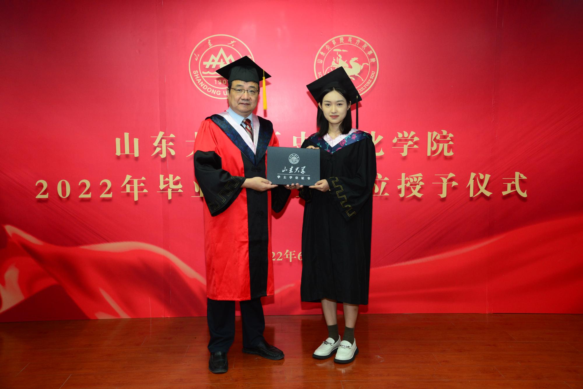 毕业典礼后,学院举行了2022届毕业生学位授予仪式。王芬宣读研究生《学位授予决定》、曲春梅宣读本科生《学位授予决定》。毕业生身着学位服依次登台,方辉逐一与本硕博毕业生拨正流苏、颁发学位证书,并合影留念。