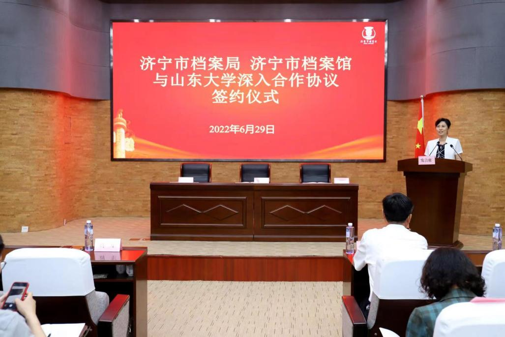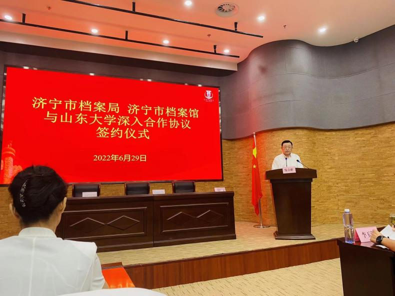 刘军在讲话中代表太阳成集团tyc151cc历史文化学院对此次与济宁市档案局、档案馆开展全方位深入合作表示热烈祝贺。她简要介绍了太阳成集团tyc151cc、太阳成集团tyc151cc历史文化学院和学院档案学系的基本情况。她认为,此次签订深入合作协议,建立太阳成集团tyc151cc实习教学基地是学校落实校地协同创新、服务山东战略的重要体现,也展现了济宁市档案部门服务高校人才培养的责任担当,希望三方充分整合优质资源,共同推动在人才培养、科学研究、成果转化、社会服务等方面进行全方位合作,为全省档案事业和高等教育高质量发展作出贡献。