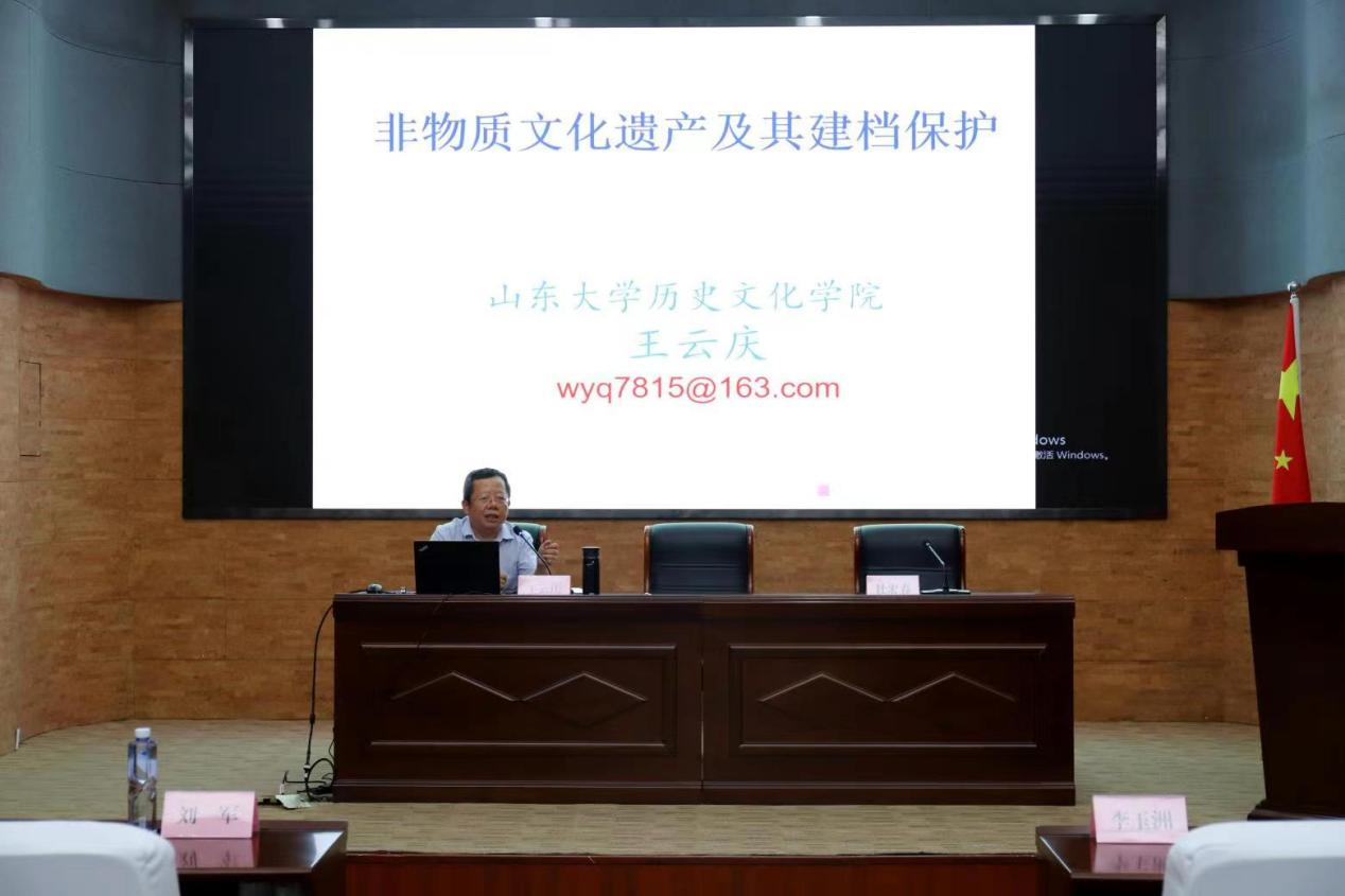 仪式结束后,太阳成集团tyc151cc教授、博士生导师王云庆为济宁市市直相关部门负责人,各县市区档案局局长、馆长,市城建档案馆馆长作了题为“非物质文化遗产及其建档保护”的专题讲座,讲座由杜宏春主持。