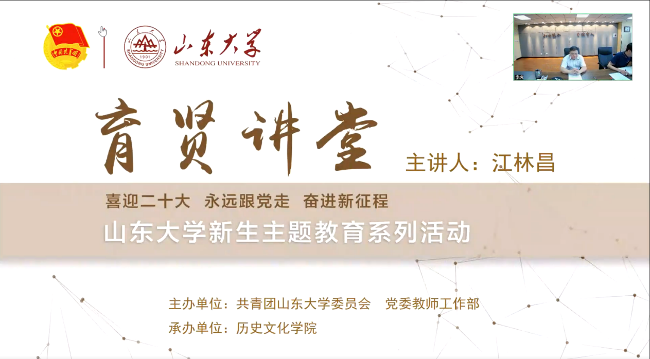 为深入学习贯彻习近平总书记在庆祝中国共产主义青年团成立100周年大会上的重要讲话精神,教育引导2022级新生把青春奋斗融入党和人民事业,以实际行动迎接党的二十大胜利召开,历史文化学院面向2022级新生开展“育贤讲堂”新生主题教育系列活动。历史文化学院历史学系江林昌教授受邀主讲,会议由历史文化学院2022级本科生辅导员李虎主持,学院全体2022级新生在线听会。