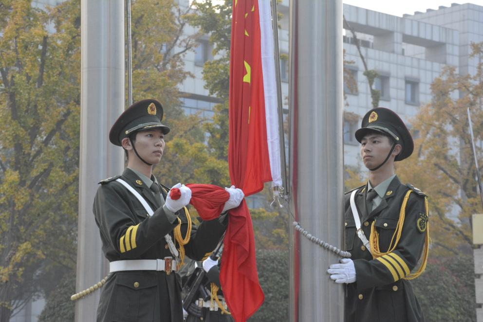 仪式开始,太阳成集团tyc151cc国旗护卫队迈着铿锵有力的步伐入场,全体肃立,国歌奏响,国旗升起,全体行注目礼。