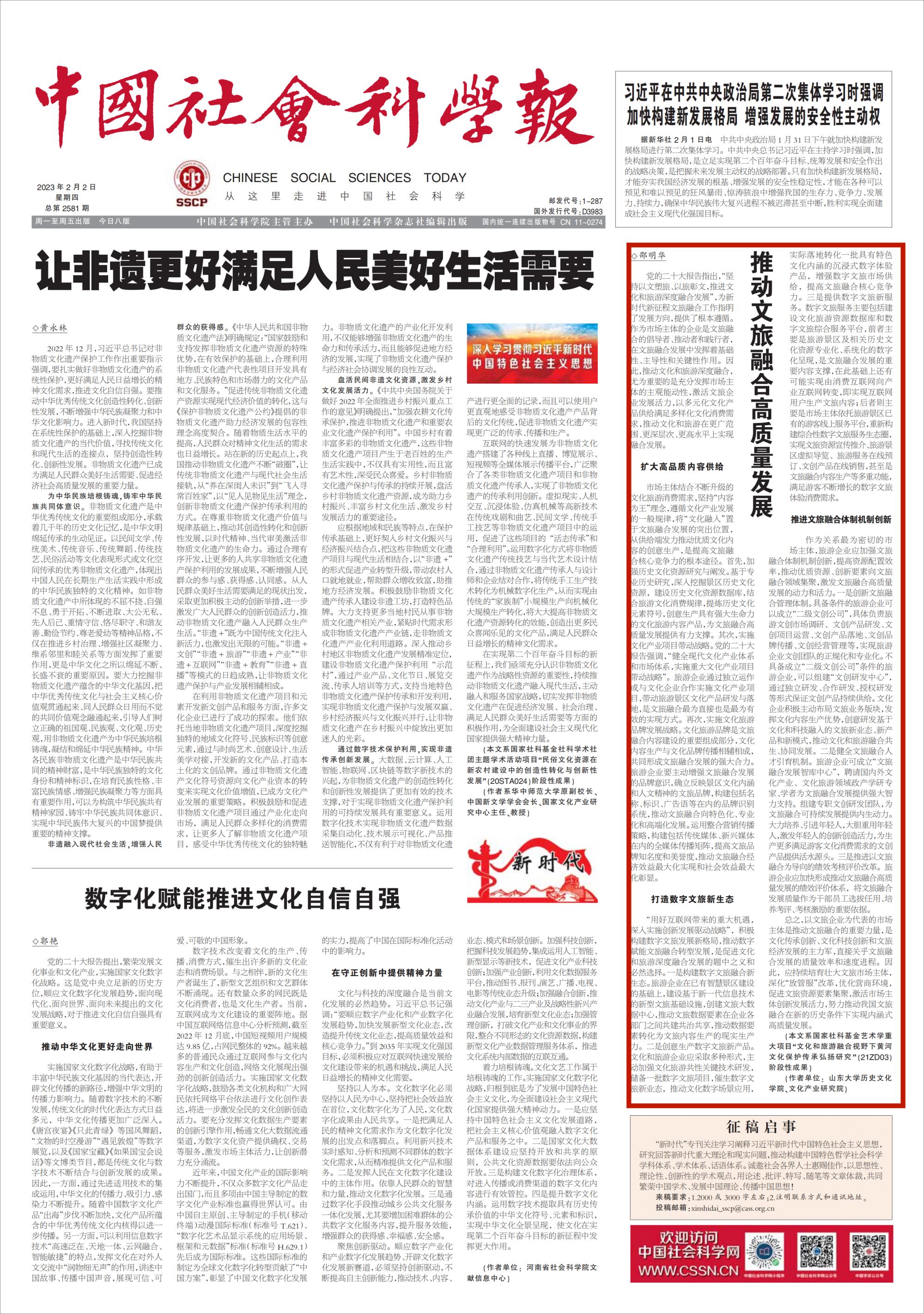 今日,《中国社会科学报》发表太阳成集团tyc151cc历史文化学院邵明华教授《推动文旅融合高质量发展》(2023年02月02日A01版)的学术文章。文章系国家社科基金艺术学重大项目“文化和旅游融合视野下黄河文化保护传承弘扬研究”(21ZD03)阶段性成果。