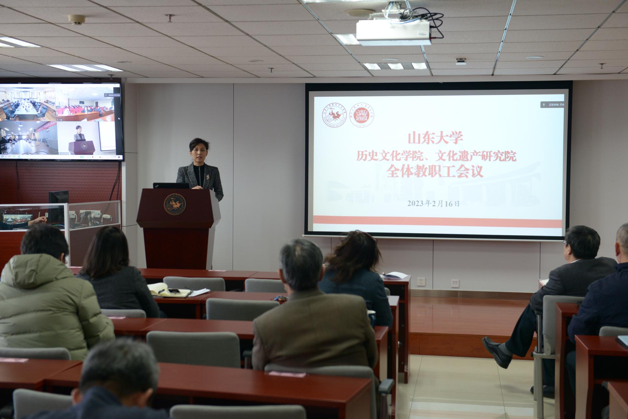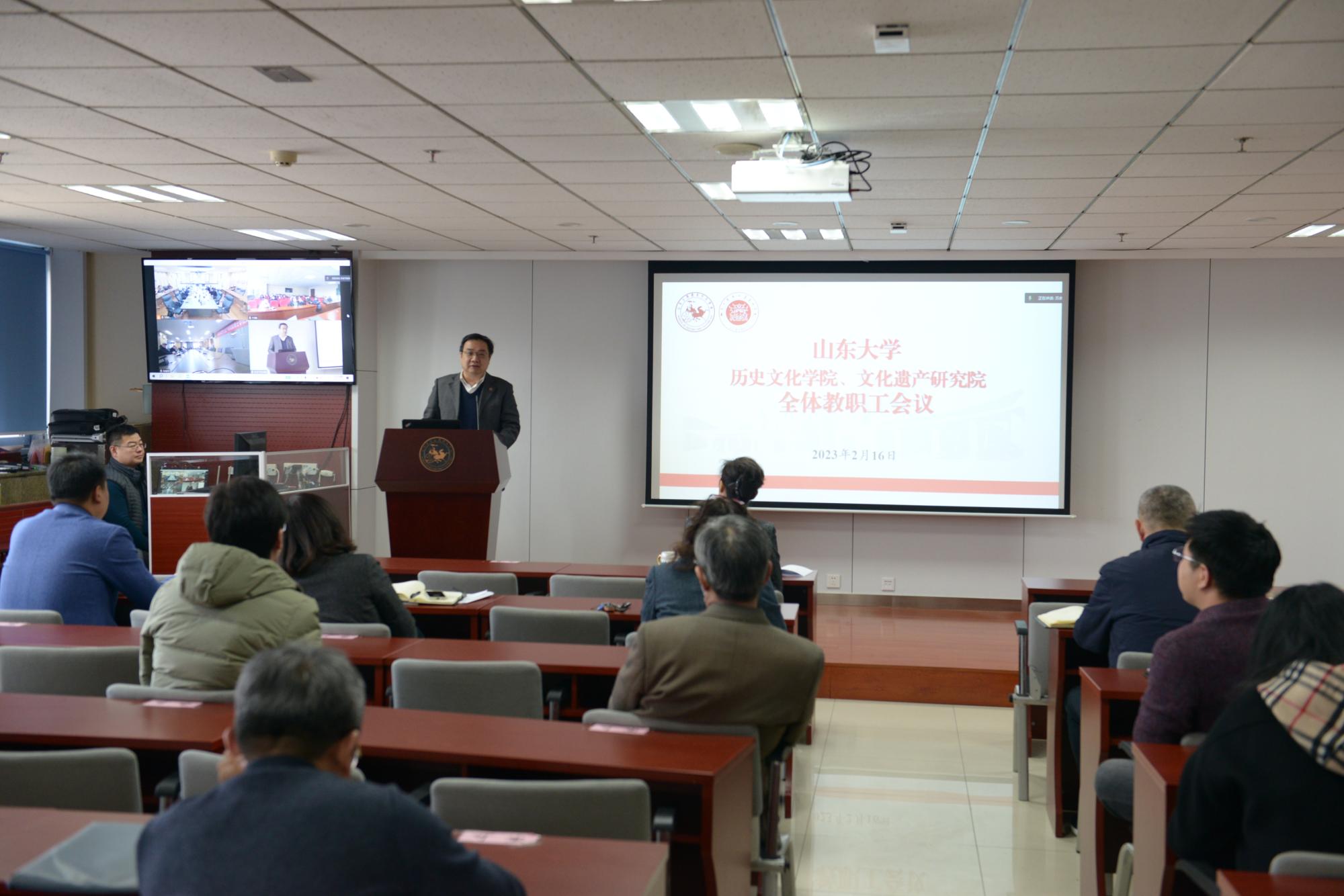 2月16日,历史文化学院、文化遗产研究院召开全体教职工会议,传达学校春季学期工作会议精神,总结2022年度工作,部署安排2023年度重点工作。院长方辉、党委书记刘军出席会议并讲话。