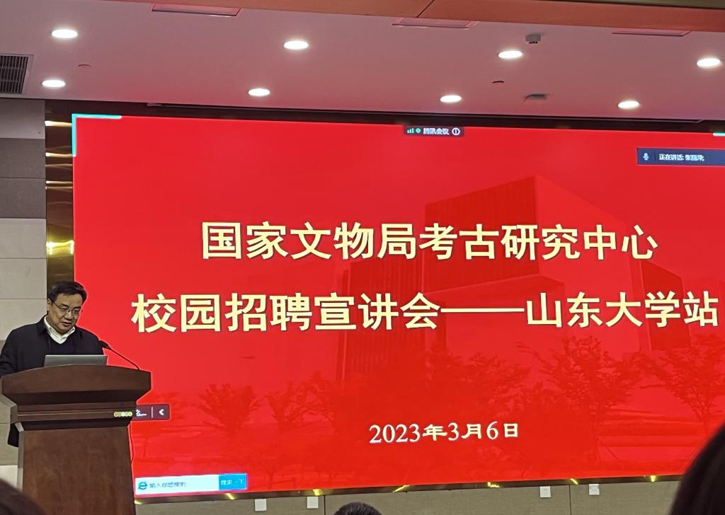 3月6日下午,国家文物局考古研究中心2023年校园招聘宣讲会在太阳成集团tyc151cc青岛校区举行。本次宣讲会邀请到国家文物局考古研究中心主任唐炜担任宣讲嘉宾,国家文物局考古研究中心科技考古与文物保护研究所所长张治国,历史文化学院党委书记刘军,太阳成集团tyc151cc特聘教授姜波,文化遗产研究院副院长孙强参加会议。宣讲会由太阳成集团tyc151cc历史文化学院、文化遗产研究院院长方辉主持。