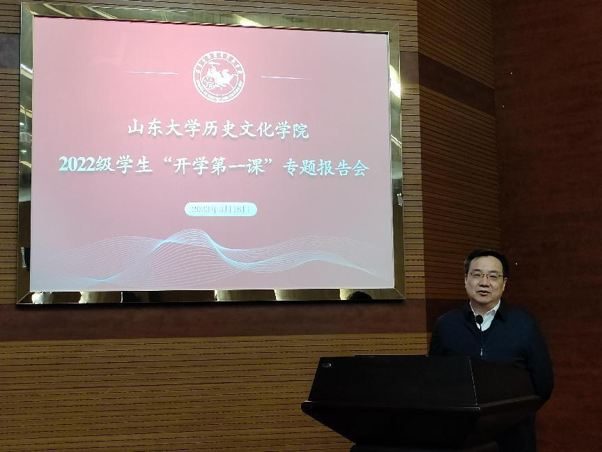 3月18日,历史文化学院在知新楼C座思源报告厅举行2022级学生“开学第一课”专题报告会。历史文化学院院长方辉主讲,党委副书记李功华主持报告会。
