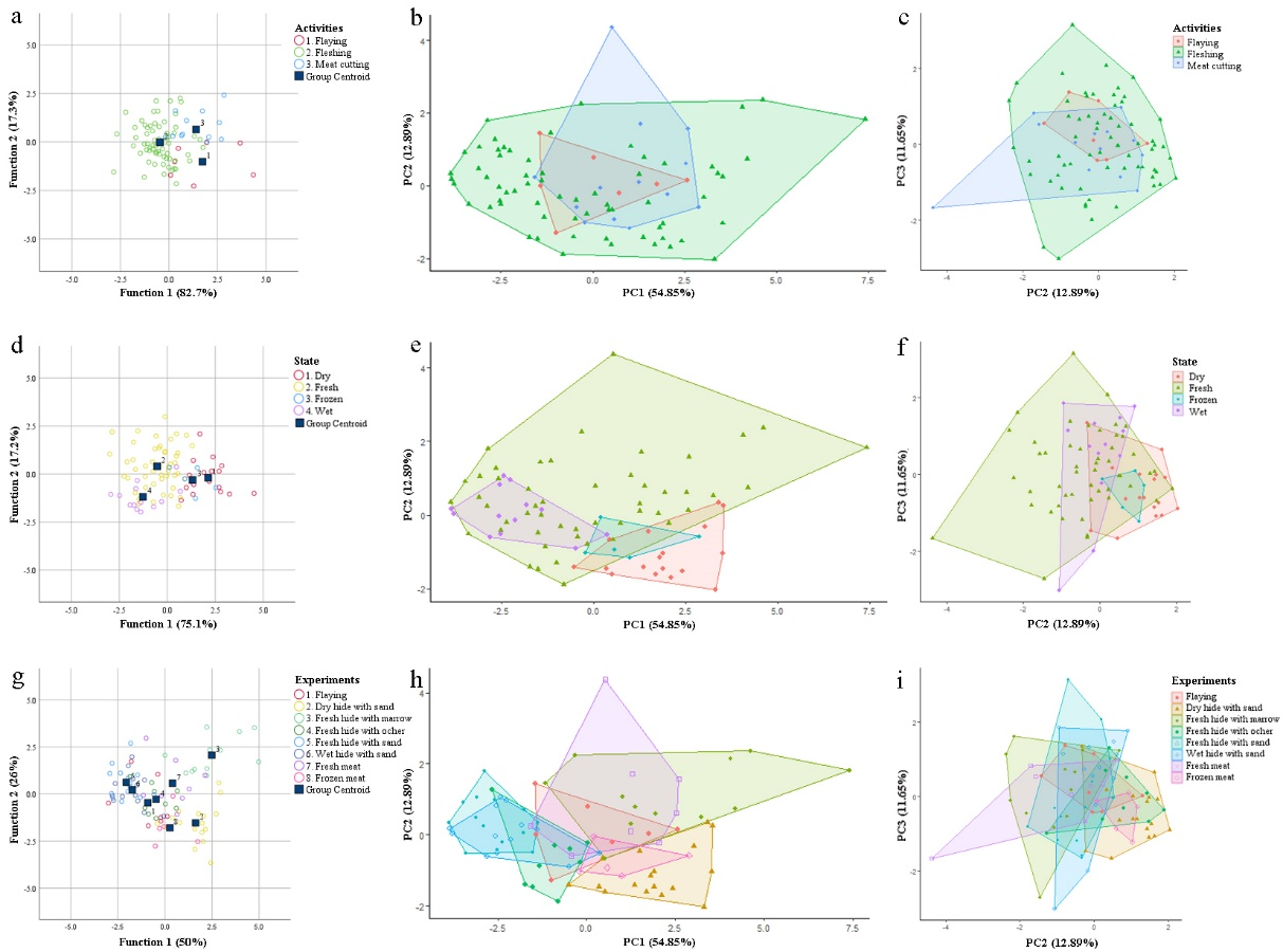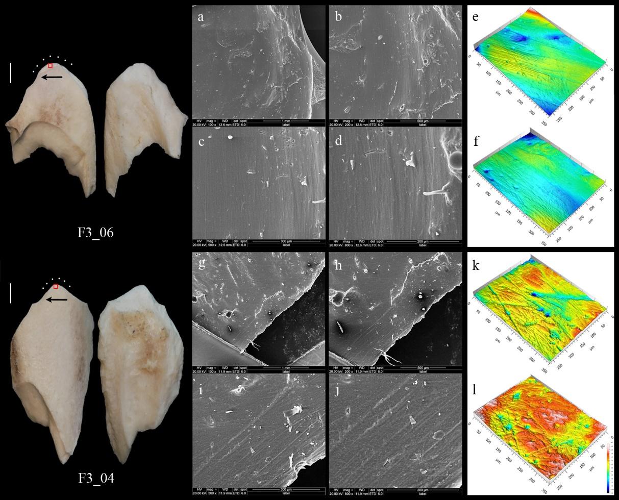 本研究使用共聚焦显微镜提取了使用区域10个ISO25178表面粗糙度参数(Sq、Ssk、Sku、Sal、Sdr、Smc、Vvv、Spc、Smc_m、Spc_m)进行分类分析,结果表明FDA在80%的情况下可以准确预测剥皮、兽皮加工和切肉活动。这项实验为接下来的灵井许昌人遗址骨器研究提供借鉴,是探索早期人类使用工具行为能力的新路径。