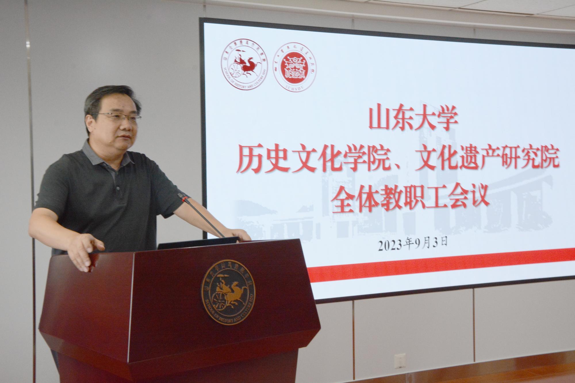 9月3日,历史文化学院、文化遗产研究院召开全体教职工会议,传达学校2023年秋季学期工作会议精神,总结学院(文研院)春季学期工作,研究部署秋季学期重点工作。院长方辉出席会议并讲话。党委书记刘军主持会议并讲话。学校主题教育第一指导组副组长刘冰列席会议。