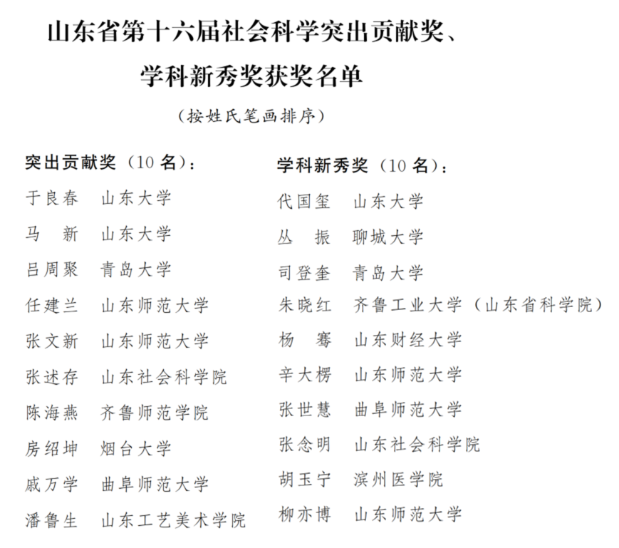 近日,山东省人民政府公布了山东省第十六届社会科学突出贡献奖、学科新秀奖获奖人员名单,学院马新教授荣获突出贡献奖,代国玺教授荣获学科新秀奖。
