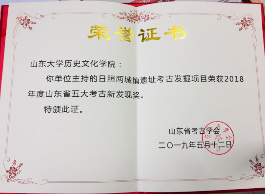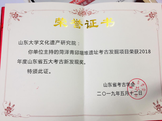 2018年度山东省田野考古工作汇报会上, 文化遗产研究院主持的菏泽青邱堌堆遗址考古发掘项目和历史文化学院主持的日照两城镇遗址考古发掘项目分别荣获2018年山东省五大考古新发现奖。