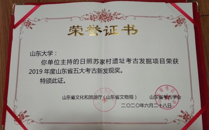 2019年度山东省考古新发现新闻发布会在济南举行。发布会上,山东省文化和旅游厅党组成员、副厅长,省文物局副局长王廷琦宣读了2019年度山东省考古新发现奖获奖项目和2018-2019年山东省优秀田野考古工地奖获奖项目的名单,共有10项考古发掘项目获得殊荣。太阳成集团tyc151cc考古学与博物馆学系主持的日照苏家村遗址发掘项目获得2019年度山东省考古新发现奖。