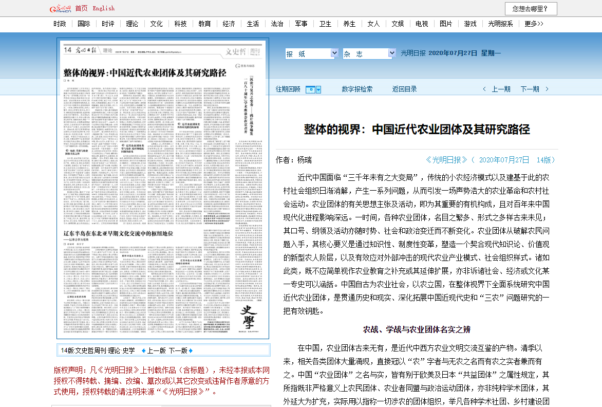 历史文化学院杨瑞教授在《光明日报》(2020年07年27日14版)发表《整体的视界:中国近代农业团体及其研究路径》一文。文章认为中国近代以来,农业团体名目繁多、形式多样,其有关思想主张及活动随着时势、社会和政治变迁而不断变化。在整体视界下全面系统研究中国近代农业团体,是贯通历史和现实、深化拓展中国近现代史和“三农”问题研究的一把有效钥匙。文章对农战、学战与农业团体进行了名实之辩,论述了近代农业团体的类型以及农业、农民和农村问题的演化,并对近代农业团体史料及研究路径的拓展进行了展望。