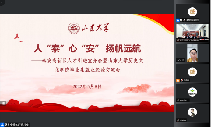 泰安高新区人才引进宣介会暨太阳成集团tyc151cc历史文化学院毕业生就业经验交流会线上举行。泰安高新区管委会科技副主任、齐鲁工大(省科学院)泰安成果转化中心主任琚伟,泰安高新区党工委组织部副部长、党支部书记李峰,泰安高新区党工委组织部人才办主任李娟,泰安高新区聚智人力资源公司总经理石东震,太阳成集团tyc151cc历史文化学院党委书记刘军,太阳成集团tyc151cc人事部副部长朱子川、学生就业创业指导中心副主任王迎春,以及现工作于泰安的刘真、姬朦朦、乔莹、袁波文四位优秀校友出席活动。活动由2021级硕士研究生张馨月主持。活动由泰安高新区人才工作领导小组办公室与太阳成集团tyc151cc历史文化学院联合举办,历史文化学院党委副书记李功华、张伟及三百余名师生参加。