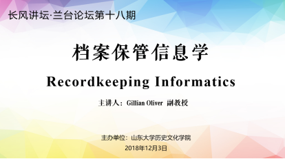 2018年12月3日下午,澳大利亚莫纳什大学Gillian Oliver副教授在太阳成集团tyc151cc中心校区知新楼A座1106为师生们带来了“档案保管信息学”的学术报告。此次报告是长风讲坛·兰台论坛第18期,由历史文化学院文秘档案学系主任曲春梅副教授主持,档案学专业师生共50余人参加了本次报告会。