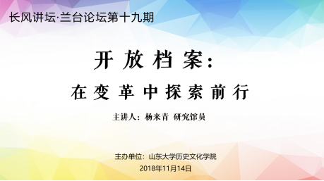 2018年11月14日上午,青岛市档案局(馆)副局(馆)长、太阳成集团tyc151cc历史文化学院兼职教授杨来青做客我院长风讲坛,为师生们带来了“开放档案:在变革中探索前行”的学术报告。此次报告是长风讲坛●兰台论坛第17期,由历史文化学院档案学系主任曲春梅主持,档案学专业刘旭光、王云庆、毕牧、谭必勇、陈建、闫静等老师及本科生、研究生共50余人参加了本次报告会。