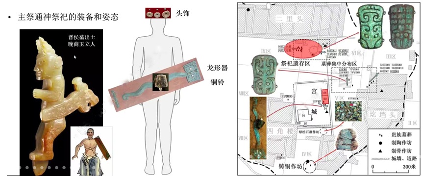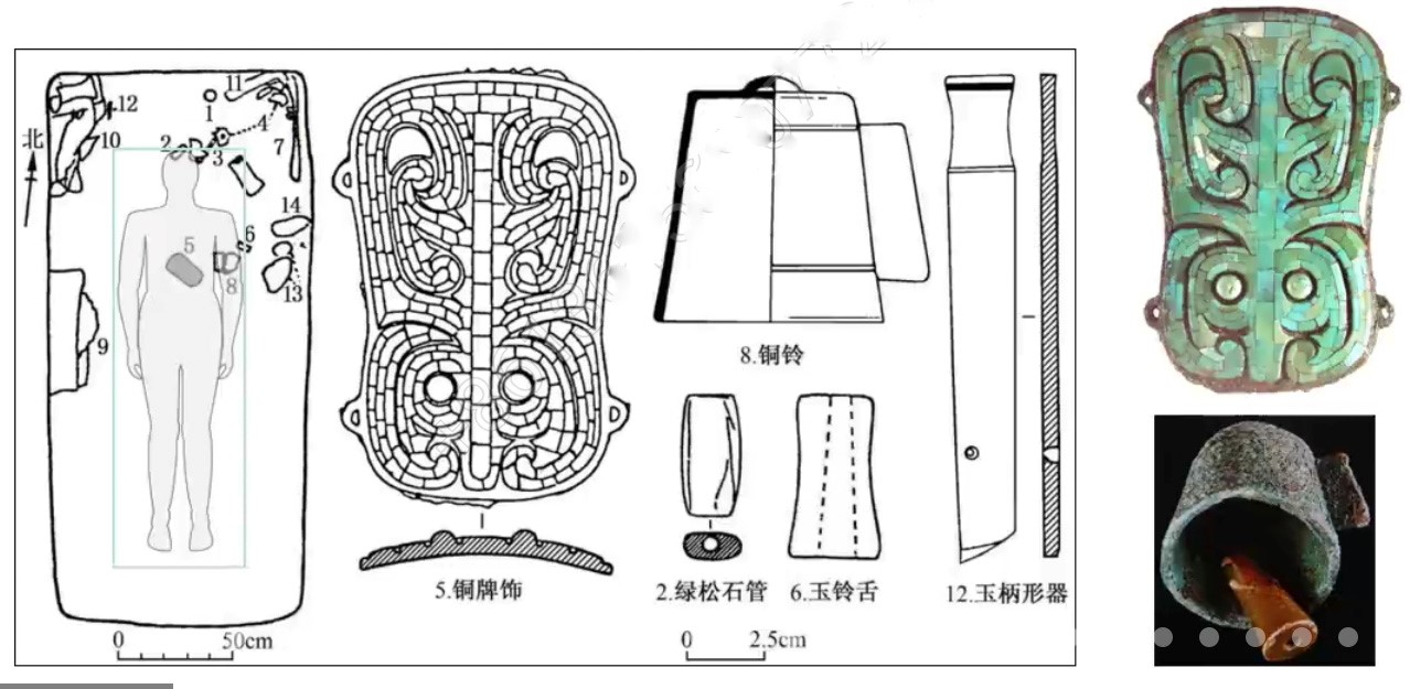 第四部分是“神职人员的构成”。王青教授认为二里头遗址应存在由主祭和辅祭组成的祭司集团,目前已发现10人左右,他们在墓葬中可能均随葬不同类型的通神法器和法服。主祭已知有02VM3的墓主,其通神法器为镶嵌龙形器和铜铃,墓主头部附近出土的海贝、白陶斗笠形器、绿松石珠、鹰形玉笄等可能均属于通神法服的项饰或头饰。辅祭则分为两级,第一级辅祭已知有81VM4、84VIM11、87VIM57等墓主,他们的通神法器有镶嵌铜牌饰、铜铃漆鼓、玉璧戚等,通神法服的装饰有绿松石珠等。第二级辅祭有75VIKM3等墓主,其通神法器有镶嵌木(或漆)牌饰、玉璧戚等,通神法服的装饰有圆铜泡等。祭祀用的礼器已知有刻纹陶礼器透底器、大口尊、盆等,以及漆觚、玉柄形器等。祭祀的场所已知主要在宗庙和祭祀区,根据杜金鹏先生的研究,祭祀区内有坛、墠类祭祀遗迹。祭祀集团应是专守祭祀神祇祖先、沟通天地人神,内部存在不同等级。其构成人员可能来自不同区域,如87VIM57的墓主随葬鳄图案的镶嵌绿松石铜牌饰,说明其可能与《左传》记载的为陶唐氏服务的豢龙氏有关,81VM4的墓主的镶嵌绿松石铜牌饰则以羽冠为题材,他可能与崇拜鸟神灵的东夷族有关。 另外,王青教授对比了良渚神人兽面纹、日照两城镇龙山时期的羽冠鸟面形象、石峁和二里头的兽面形象、商代饕餮神灵形象,认为它们是一脉相承的关系,得出广义的兽面神灵起源于史前东部沿海地区的结论。