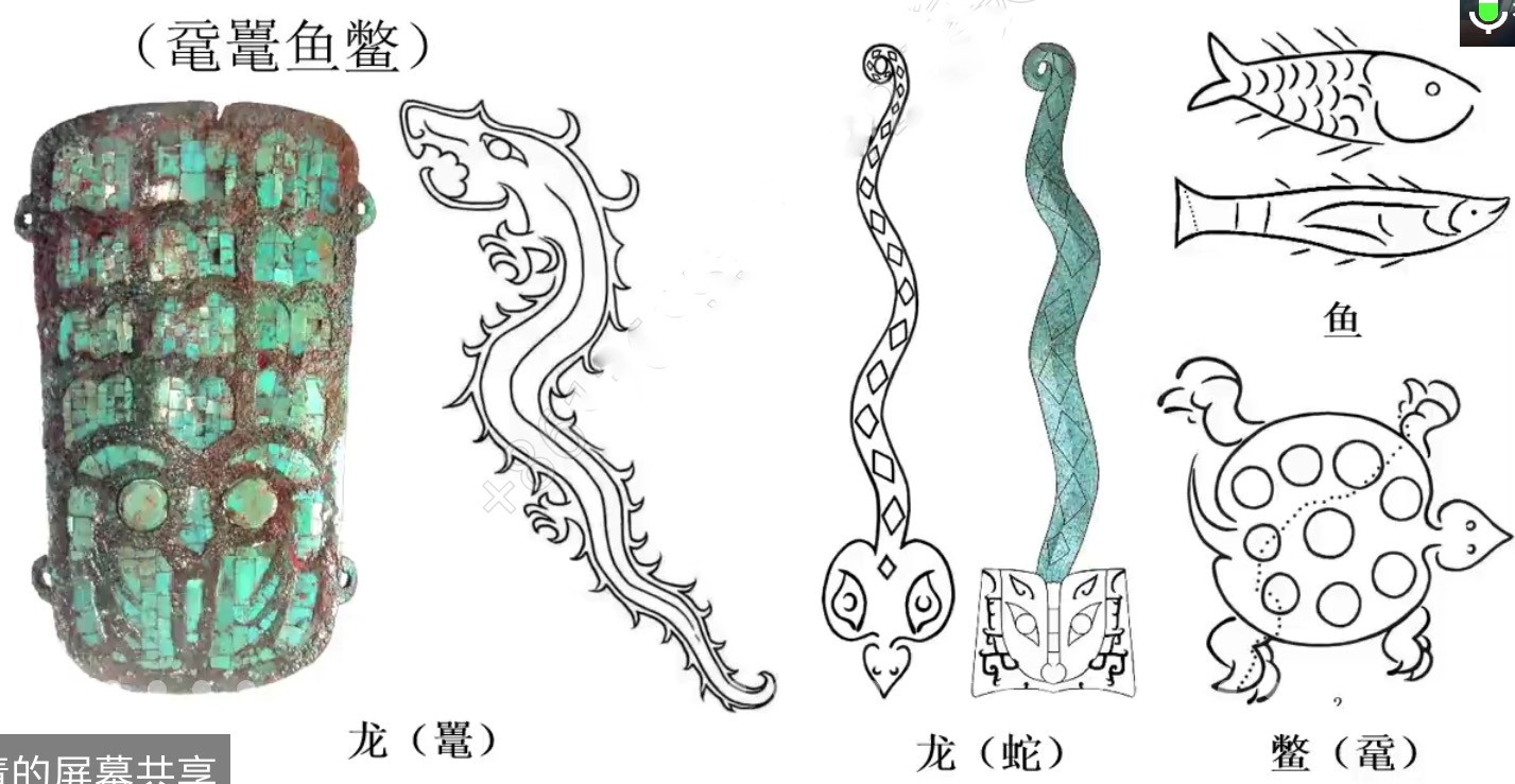 第三部分是“神界系统的构成”。王青教授认为从二里头遗址出土的神灵崇拜相关遗物来看,夏人崇拜的神灵主要是身披鳞甲的水下神灵,具体可能主要有“鼋鼍鱼鳖”几类,它们在《考工记》中属于“鳞虫”类。此外《国语·晋语》记载“鼋鼍鱼鳖,莫不能化,唯人不能”,反映了先秦时人对“鳞虫”神性的崇拜和向往。而且通过对比各类神灵形象出现的频率和表现方法的丰富程度,可知夏人应视龙为“鳞虫”神灵家族的统领。《说文解字》也记载“(龙)鳞虫之长,能幽能明,能细能巨,能短能长,春分而登天,秋分而潜渊”。其他诸神如羽冠代表的鸟神灵和兽面代表的猛兽神灵,在夏人神界系统中应处于配享地位。