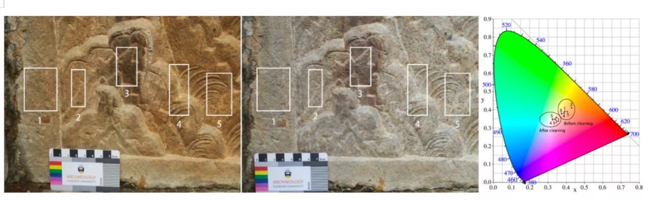 该成果依托世界文化遗产地---山东省济南市长清区灵岩寺石质文物保护项目,以千佛殿东侧经幢等文物的风化现象为研究对象,通过定性分析和拟合计算的方法,确定了红色污染物为氧化铁,并经SEM-EDS分析,揭示了石灰岩质文物表面红色污染病害为铁锰云石在水汽作用下风化沉积而成的形成机理,从而选用5%wt的EDTA溶液对石质文物红色污染物进行了有效清洗。