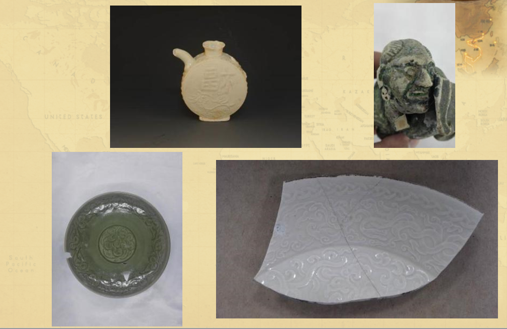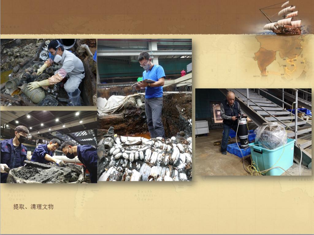 第三部分对南海一号上的船货进行了介绍。通过发掘,南海一号出土的货物数量巨大,大概有十八万件左右,文物种类比较庞杂,主要有瓷器、铁器、铜器、金银器、朱砂水银、动植物残骸等,其中既有船货和船上的生活用具,也有旅客所携带的物品。