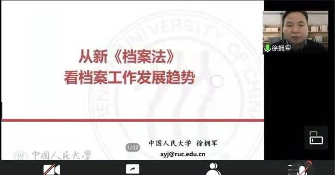 2020年12月8日晚,中国人民大学信息资源管理学院徐拥军教授应邀参加我院长风讲坛·兰台论坛,以线上会议的形式为师生们带来了“从新《档案法》看档案工作发展趋势”的学术报告。报告由历史文化学院文秘档案学系闫静副研究员主持,档案学专业刘旭光、曲春梅、毕牧、霍艳芳、陈建、许晓彤老师以及本科生、研究生参加了此次报告会。