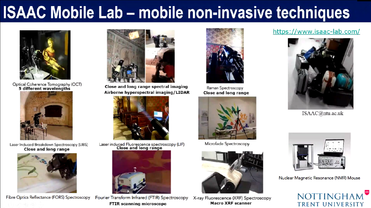 第一部分,ISAAC移动实验室的专业设备和技术手段。NTU ISAAC移动实验室的专业设备具有可携带、应用范围广的优势,包括光学相干层析成像仪(OCT)、激光诱导击穿光谱仪(LIBS)、光纤反射光谱仪、傅里叶变换红外光谱仪和红外扫描显微镜、近距/远距光谱成像仪(PRISMS)及机载高光谱成像仪、近距/远距激光诱导荧光光谱仪(LIF)、近距/远距拉曼光谱分析仪、微褪色光谱仪、X射线荧光光谱仪(XRF)等。绝大多数设备是根据文物保护和艺术史研究的需要自主研发设计,部分仪器是在已有的商业产品的基础上进行针对性的改良,从而更好推动相关研究的开展。