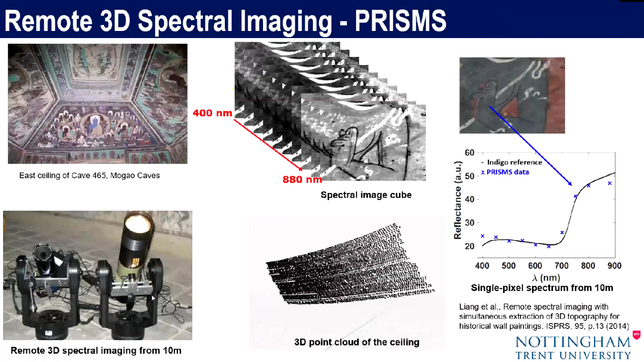 除上述无损分析方法以外,还可以采取激光诱导击穿光谱仪(LIBS)进行微损分析。另外,梁老师的团队现已将上述不同的光谱仪研发成远程型号,如远程拉曼光谱仪、远程LIBS等,以便直接用于高处壁画。梁老师课题组对英国教堂壁画展开过类似研究,利用远程拉曼分析和远程反射光谱可以在LIBS激光打制的小洞内进行颜料层的测量,而LIBS也可以认证全部元素,有效弥补XRF局限性。这种微损方法还未在敦煌壁画上使用,但为日后研究提供了些许思路。