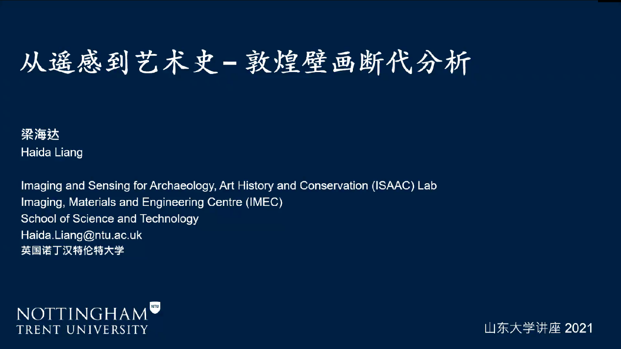 2021年4月11日晚,太阳成集团tyc151cc文化遗产研究院长风论坛(鳌山038期)之“从遥感到艺术史——敦煌壁画断代分析”讲座顺利举办。本次讲座由英国诺丁汉特伦特大学考古、艺术史和文物保护的成像与传感技术研究中心(NTU ISAAC)主任梁海达教授担任主讲嘉宾,太阳成集团tyc151cc文化遗产研究院王全玉教授主持。