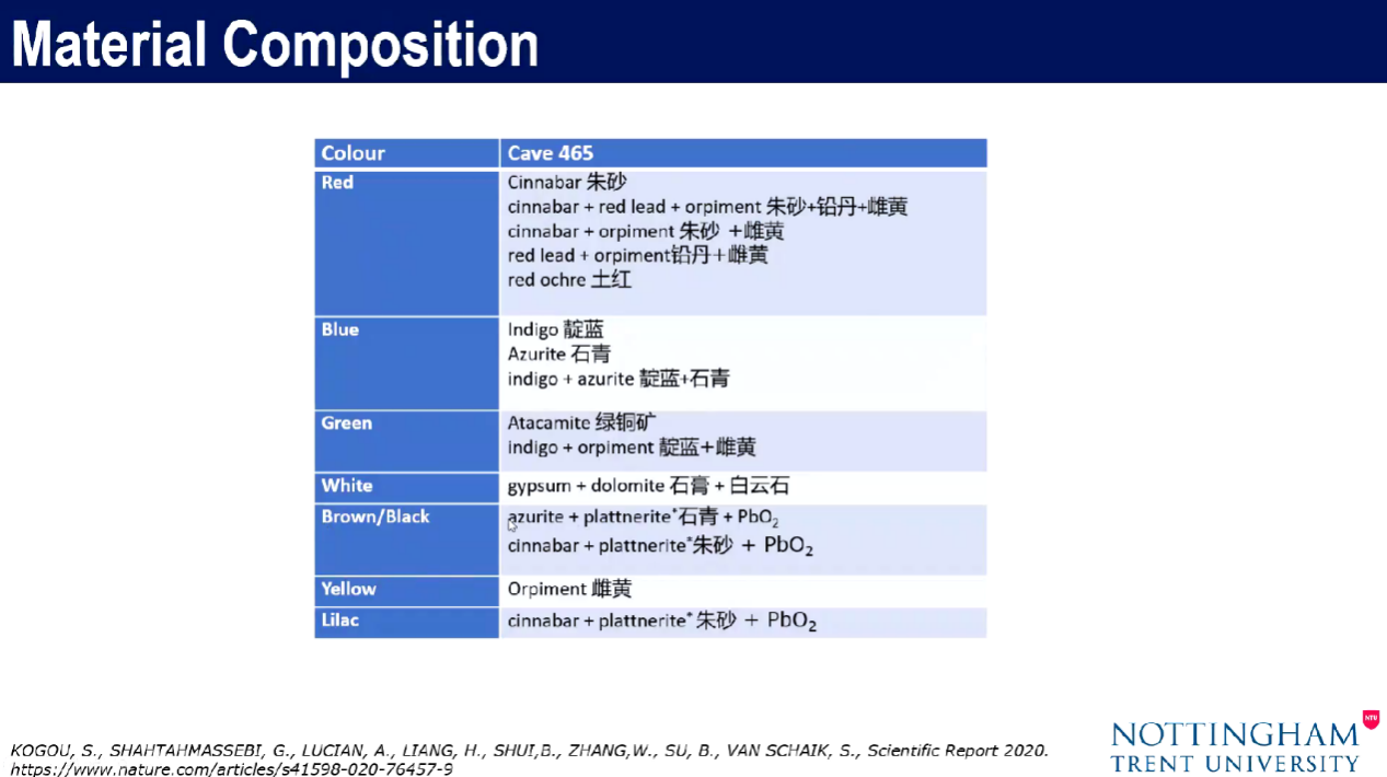 梁老师强调,有些颜料的颜色经过长时期已发生了改变,不能仅凭肉眼来判断颜料成分,如XRF在壁画上发现铅的存在,且反射光谱与二氧化铅反射光谱基本符合,所以推测原来可能有铅丹,即原本橙红色的朱砂和铅丹混合物被氧化为棕黑色的二氧化铅。还有某些壁画上灰色的树,经XRF分析有砷,拉曼分析判定为雌黄和靛蓝的组合物,原本应呈绿色,如今部分雌黄已褪为灰色。