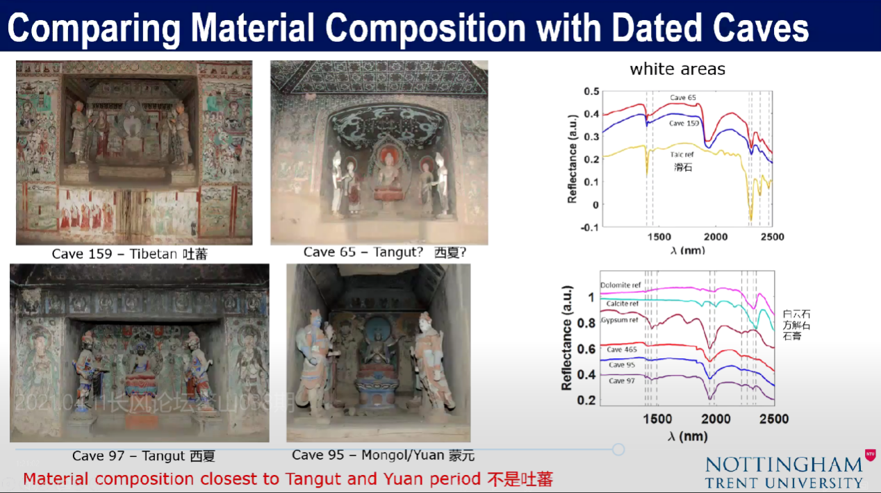 除此之外,为明确465窟的具体时代,团队特选取吐蕃、西夏和蒙元三个时期的代表性石窟,对其壁画颜料组合进行比较研究。159窟属吐蕃时期、65和97窟属西夏时期、95窟则为蒙元初期,三个窟内壁画上的白色颜料最能区分时代,65窟和159窟的白色以滑石为原料,465窟和95窟、97窟的白色以白云石、方解石和石膏混合物为颜料。因而可以排除465窟属吐蕃窟的可能性,65窟属西夏时期的说法也可能存疑。总之,465窟白色颜料组合和95窟、97窟比较接近,即归属于西夏晚期、蒙元初期较符合。