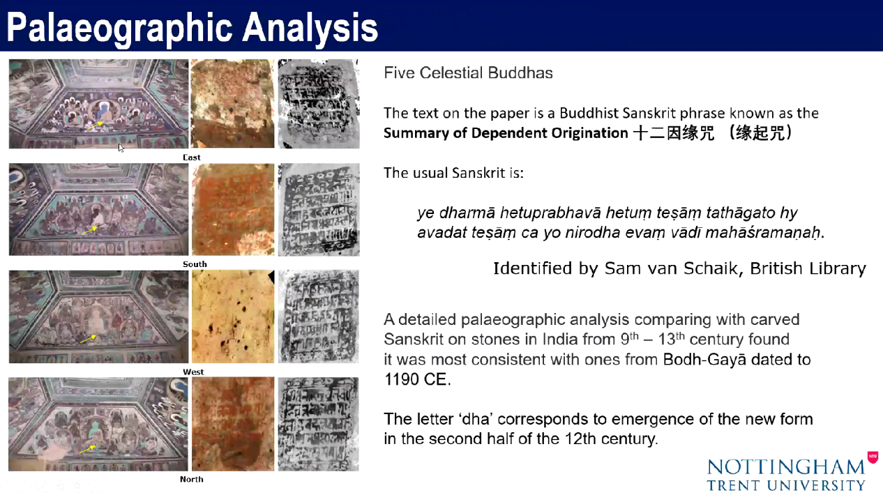 在图像研究方面,红外光谱在900纳米处的分析发现壁画底稿线的存在;光学相干断层扫描(OCT)在不同深度的扫描提供了定稿线和初稿线的确切证据,也可以区分开不同颜料层的裂纹;得益于大面积反射光谱扫描后的自动成像分析,发现壁画人物的精制五官。在文字方面,465窟西披某粉红色区域在光谱分析下隐约可见一张纸,采用自动处理PCA方法发现梵文题记的存在;窟顶部五方佛脚下均贴附纸张,数据自动处理发现是反向贴敷的梵文,经学者研读认定为十二因缘咒。字体接近12世纪末年风格,从而提供了465窟断代信息。结合颜料和文字信息,推测465窟年代为12世纪末期至13世纪前期。具体细节可参考KOGOU, S., SHAHTAHMASSEBI, G., LUCIAN, A., LIANG, H., SHUI,B., ZHANG,W., SU, B., VAN SCHAIK, S., 2020. From remote sensing and machine learning to the history of the Silk Road: large scale material identification on wall paintings. Scientific Report 10, 19312, https://doi.org/10.1038/s41598-020-76457-9