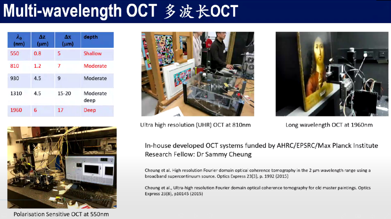 第二部分,光谱成像仪和光学相干断层扫描仪的案例分析。反射光谱可以作为颜料或其他物质的指纹,告诉我们物质的具体属性。通过这种方法,可以发现之前肉眼未发现的修复痕迹、虫蛀和裂缝痕迹等。同时,梁老师也借助光学相干断层扫描仪(OCT)对画作颜料层进行研究,OCT的优势在于不接触文物本身,在上方三厘米左右进行激光扫描,局限是扫描深度不尽如人意。总之,借助OCT可以清晰发现不同深度颜料层的具体情况,即根据光子的飞行距离判断每层的具体深度。鉴于画作颜料的特殊性质,即高反射率和强散射率,医学方面常用的OCT不能很好地研究艺术品,因此梁老师及其团队研发出长波长(2微米)OCT,结合多波长范围从可见光(VIS)到近红外(NIR)的自主研发的OCT和常规OCT,更好开展对壁画、油画等艺术品的研究。
