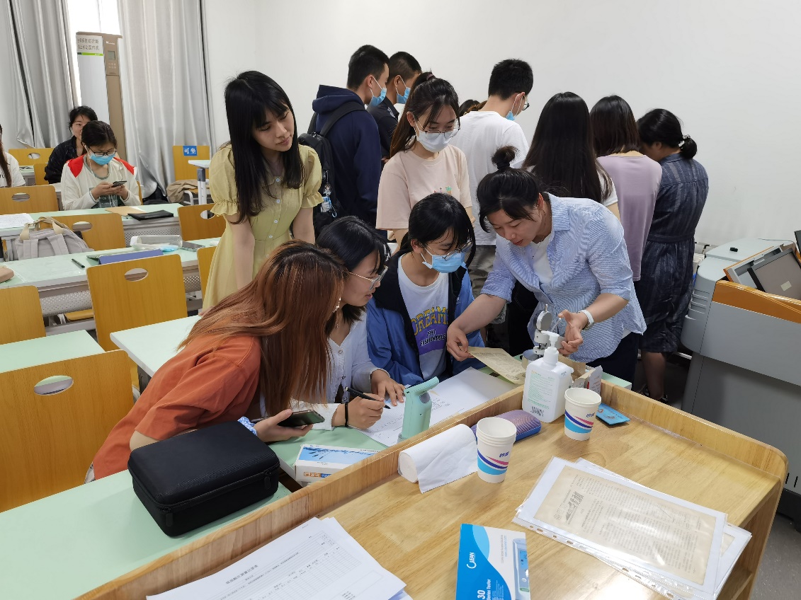 讲述完成后进入本次讲座的体验实验环节,侯老师和助理指导大家完成一个简单的纸张酸化情况测量实验。该实验使用台式pH测量仪、纸张厚度测量仪、直尺、电子天秤、色差仪对一组A4打印纸、未脱酸和脱酸后的旧机制纸进行测量和数据记录。通过实验,同学们体会到了科学方法在档案保护中的作用,例如凭借肉眼完全无法区分的未脱酸和脱酸后的旧机制纸,使用pH测量仪可以测量到酸性和弱碱性的数值差异。