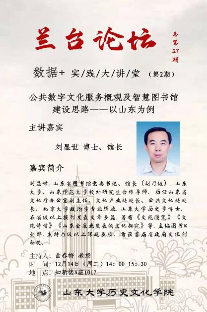 12月14日下午,山东省图书馆党委书记、馆长刘显世博士应邀来我院作题为“公共数字文化服务概观及智慧图书馆发展思路——以山东为例”的专题报告。此次学术报告是兰台论坛●“数据+”实践大讲堂第2期。报告由文秘档案学系主任曲春梅教授主持,部分图情专硕导师、文秘档案学系师生参加了此次报告会。