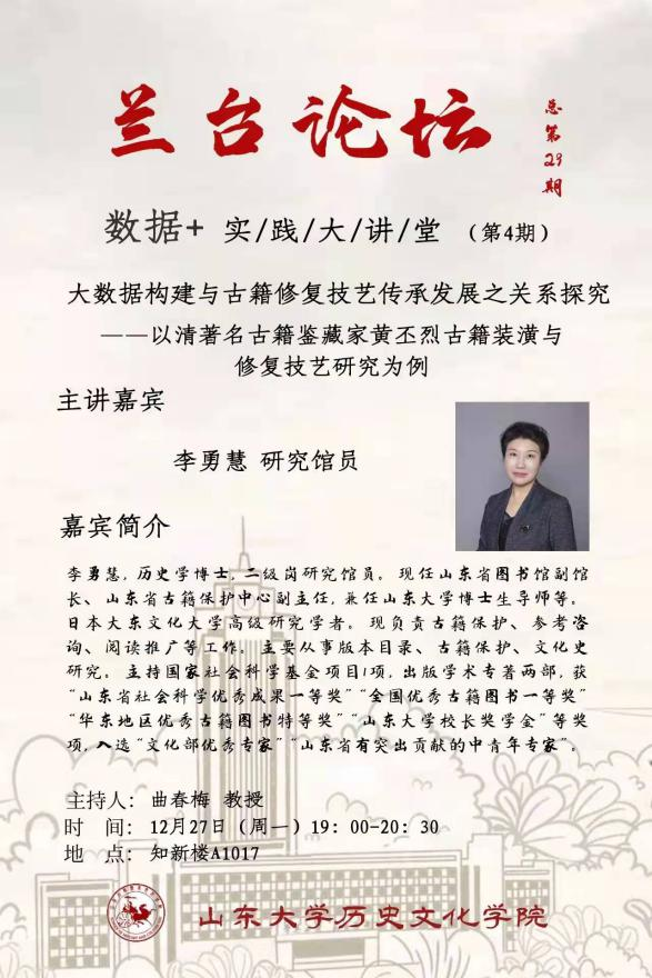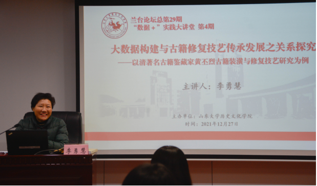 2021年12月27日晚,山东省图书馆副馆长、山东省古籍保护中心副主任李勇慧研究馆员应邀为我院师生作题为“大数据构建与古籍修复技艺传承发展之关系探究——以清著名古籍鉴藏家黄丕烈古籍装潢与修复技艺研究为例”的专题讲座。此次讲座为兰台论坛·“数据+”实践大讲堂第4期。图情专硕部分师生参加了此次讲座,讲座由文秘档案学系主任曲春梅教授主持。