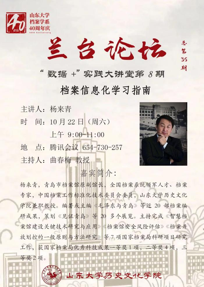 10月22日上午,全国档案专家、青岛市档案馆原副馆长杨来青作客兰台论坛·“数据+”实践大讲堂,为我院师生作“档案信息化学习指南”专题报告(线上)。历史文化学院副院长曲春梅教授主持报告。