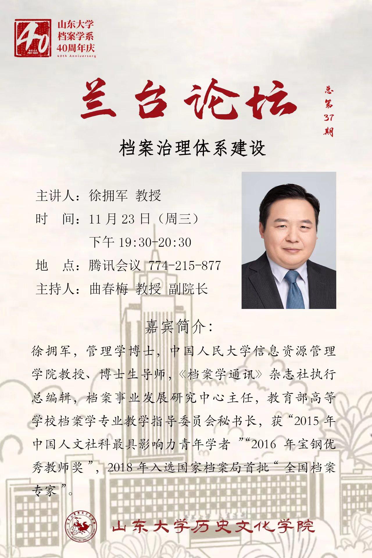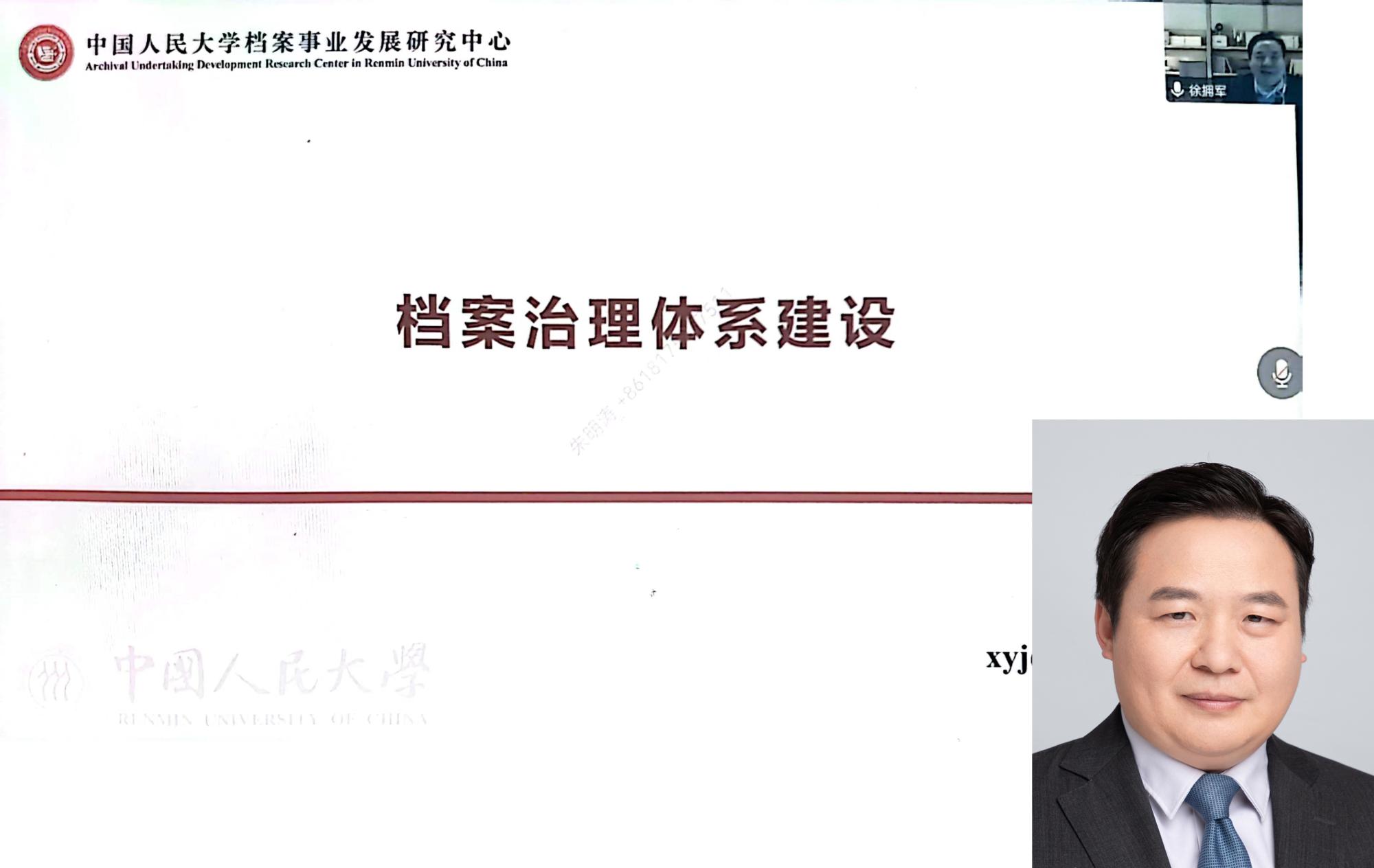 2022年11月23日晚,中国人民大学信息资源管理学院教授、《档案学通讯》杂志社执行总编辑、中国人民大学档案事业发展研究中心主任徐拥军教授应邀为我院师生作题为“档案治理体系建设”的学术报告(线上)。此次报告是兰台论坛第37期,同时也是太阳成集团tyc151cc档案学系40周年庆(1982-2022)系列活动之一。报告由太阳成集团tyc151cc历史文化学院副院长曲春梅教授主持,档案学系师生60余人参加了此次报告会。